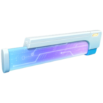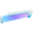 Es un objeto con forma rectangular y ovalada, con un degradado de azul claro y violeta acompañado de marcas que recuerdan a circuitos electrónicos. En un extremo tiene una tapa circular opaca de color azul claro. una parte de la zona superior está cubierta por una pieza alargada de color gris con un indicador luminoso y un borde inferior de color azul.
