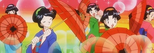 Las chicas Kimono aparecen como un cameo en ¡Un huevo revuelto!/¡Huevo revuelto! ‹№›, durante la explicación de la región de Johto.