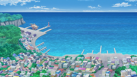Los faros de la ciudad aparecen brevemente durante la presentación que hace Lyra/Lira para el Festival de Johto en Sinnoh en el episodio ¡Un huevo revuelto!/¡Huevo revuelto! ‹№›.