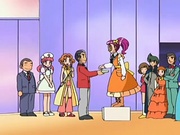 Se ve a todos los coordinadores detrás de Jessilina, quien se encuentra frente a los jueces mientras que Raúl Contesta le entrega el listón/cinta Majolica. James y Meowth lloran de la felicidad.