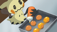 Disfraz del Mimikyu de Jessie protegiéndolo de la cola férrea de Pikachu y haciéndolo cambiar a su forma descubierta.)