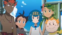 - Ash se reencuentra con el profesor Kukui, la profesora Burnet/Pimpinela, Lana/Nereida, Mallow/Lulú, Kiawe, Sophocles/Chris y la RotomDex, mientras que Goh los conoce.