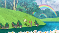 Liko y los demás llegan a la cumbre de la Montaña Pericarpio, donde la tierra se une con el cielo, todos quedan maravillados con el paisaje y en eso el Rayquaza negro se aparece ante todos y con su poder logra disipar las nubes descubriendo un hermoso bioma verde, donde ven muchos árboles de bayas de gran tamaño y donde la atmosfera es cálida a pesar de estar muy alto en la montaña.