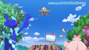 - Durante el avance del episodio, en la escena donde e-Nigma donde se encuentra platicando con los protagonistas, se observa al Gholdengo de Doti sentado enfrente de su entrenadora mientras que en el episodio emitido, este Pokémon no se encuentra y es cambiado por Quaxwell.