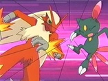 Ahora Harrison saca a Blaziken y todos se quedan sorprendidos por ese Pokémon tan extraño que ni siquiera la Pokédex lo reconoce. a lo que Brock supone que debe ser un Pokémon proveniente de la región Hoenn. Harrison le ordena ataque rápido y después Sneasel lanza dos bola de sombra/bola sombra a la vez, pero Blaziken vuelve atacar dejando al Sneasel debilitado, rápidamente le lanza la Pokébola/Poké Ball y le atrapa.