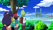 Ash, Cilan/Millo e Iris siguen su camino hacia ciudad Castelia/Porcelana, pero deben pasar por un puente que divide el Bosque Azulejo de ciudad Castelia/Porcelana, el puente más grande en la región de Unova/Teselia, nombrado Puente Saeta. Llegan a un pequeño supermercado en la entrada del puente. Ash casi choca con una chica, por lo que se disculpa con ella. Dentro de la Tienda Pokémon, Ash conversa con la profesora Juniper/Encina, para hacer un intercambio, el cual fue, Sewaddle por Pidove.