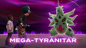 | Comenzando el combate contra el Mega-Tyranitar descontrolado. | Obteniendo la Tyranitarita, tras derrotar al Mega-Tyranitar descontrolado. |