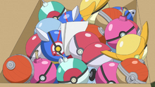 La Bombabola/Bomba-bomba Ball aparece en el episodio Oria y la forjadora de Poké Balls/Oria y la fabricante de Pokébolas ‹№›. Es de color rosa, con una mecha en la zona superior que se prende al cogerla en la mano. Es muy sensible y es fácil que explote antes de ser lanzada. |