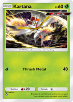 - Como ocurre todos las cartas de Ultraentes, Kartana tiene su ataque basado en un género musical: el thrash metal, un subgénero del heavy metal más agresivo y riffs cortantes de guitarra. El nombre hace referencia al tipo acero de Kartana, así como al hábito del Pokémon de cortar cosas en dos.