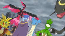 En ¡La columna de fuego!/El pilar de fuego ‹№›, Kleavor, Lapras, Moltres y Arboliva reaccionan a Flamariete de Lucius en la Área Cero. Cuando el Rayquaza Negro llega al lugar, los cinco héroes de Lucius y Pagogo reaccionan a su aparición y se colocan frente a él.