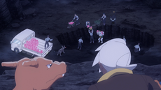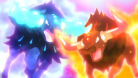 La furia taurina de los Tauros de Paldea de Indi y Rubina se vuelve más fuerte, y adquiere el aura rosada del laqualio/laquium por encima del aura azul de la furia taurina del Tauros de Indi, y del aura naranja de la furia taurina del Tauros de Rubina. |