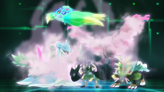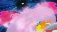 El ataque ala del Moltres de los Seis Héroes adquiere el brillo rosado del laqualio/laquium y se vuelve más poderoso. |