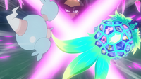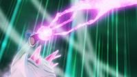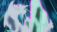 El rayo hielo del Lapras de los Seis Héroes se vuelve más fuerte y adquiere el brillo rosado del laqualio/laquium. |