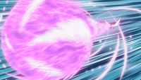 El huracán/vendaval del Moltres de los Seis Héroes adquiere el color rosado del laqualio/laquium y se vuelve más poderoso. |