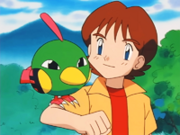 Con ayuda de Ash y sus amigos, quienes le regalan una máscara de Wooper, comienza a tomar un poco más de confianza y hace una actuación, la cual es interrumpida por el Equipo/Team Rocket, después de vencerlos una maestra le pide actuar frente a un grupo de preescolares, donde se da cuenta que no ocupa la máscara y pierde el miedo de actuar en público.