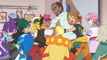 En Adonde lleve la aventura/A donde la aventura nos lleve ‹№›, tras haber permanecido al pie de la Montaña Pericarpio debido a las limitaciones del Valiente Olivino, Oria y los demás miembros de los Tacleada de Voltionautas/Aeronautas del Placaje Eléctrico, acuden al rescate de Liko, Roy, Doti y Friede tras el incidente en Laqua. Al ver que el dirigible no da más de sí, Oria presiona el botón rojo de emergencia, lo que provoca que el Valiente Olivino se transforme en una versión mejorada con impulso adicional. Cuando el dirigible llega a lo alto de la montaña, Oria sale a cubierta a ayudar a todos a regresar a la nave. Sin embargo, presencia junto a Liko, Roy y Doti como Friede y Charizard caen de la nave hacia un destino incierto. Todos los Tacleada de Voltionautas/Aeronautas del Placaje Eléctrico regresaron a la Montaña Pericarpio para buscar a Friede, aunque Excedia/Progreso había bloqueado la zona y culpado a los Tacleada de Voltionautas/Aeronautas del Placaje Eléctrico del desastre en Laqua. Al estar en una situación tan precaria, el grupo decidió disolverse.