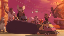 En el episodio ¡Hacia un nuevo firmamento! ¡El Valiente Olivino!/¡A buscar nuevos aires! ¡El valiente Olivino! ‹№› Liko, Rod, Crocalor, Doti y Quaxwell vuelven a recentrarse con los Pokémon del Valiente Olivino. Crocalor de Rod hambriento al ver a los tres Tatsugiri, intenta comerse al Tatsugiri con forma curvada, pero los tres Tatsugiri lo atacan al sentirse amenazados. Murdock menciona que esos no son sus Pokémon, y debido a la ausencia de Liko, Rod y Doti se unen al grupo de Pokémon. Los tres Tatsugiri atacan a Crocalor, Quaxwell y Floragato, que a su vez los persiguen a lo largo de toda la aeronave.