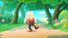 Artículo principal: Bit El Scorbunny de Gloria} aparece evolucionado en Raboot en el combate contra el Drednaw de Cathy, al cual derrota.