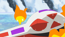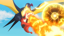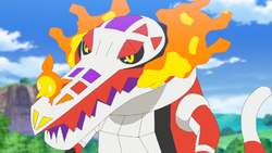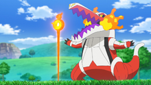 - Vuelo + lanzallamas como propulsión: En el EP1355 Crocalor usa lanzallamas mientras está subido al lomo de Kilowattrel, apuntando hacia atrás, propulsando a Kilowattrel y volviéndolo mucho más rápido, capaz incluso de atravesar el vendaval del Kingdra de Levi • (ver imagen