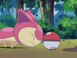 En el episodio Una fan con un plan/Un admirador con un plan ‹№› May/Aura estaba entrenando combinaciones de concurso junto a Skitty y sus demás Pokémon, pero no parecía irle bien. Skitty observa con admiración el entrenamiento del Masquerain de Drew.